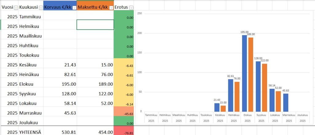 Sama virhe on graafissa myös syyskuussa 2025. Todellinen korvaussumma on ollut 128 €.
