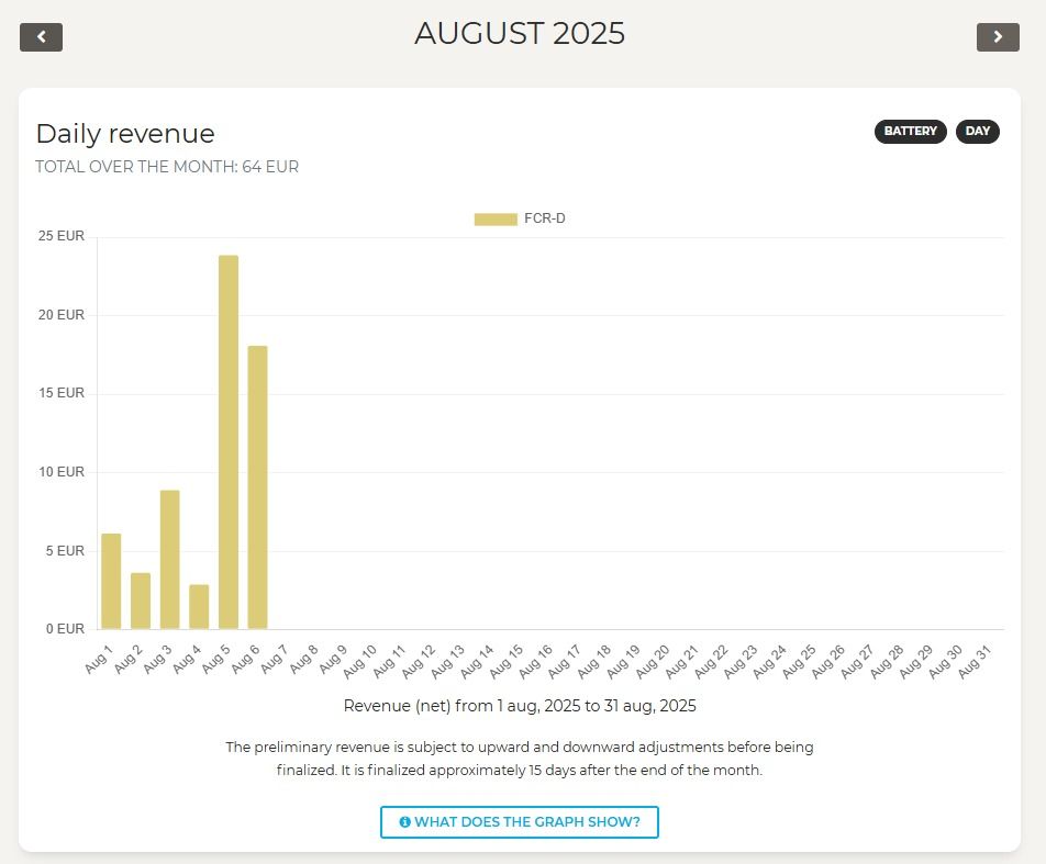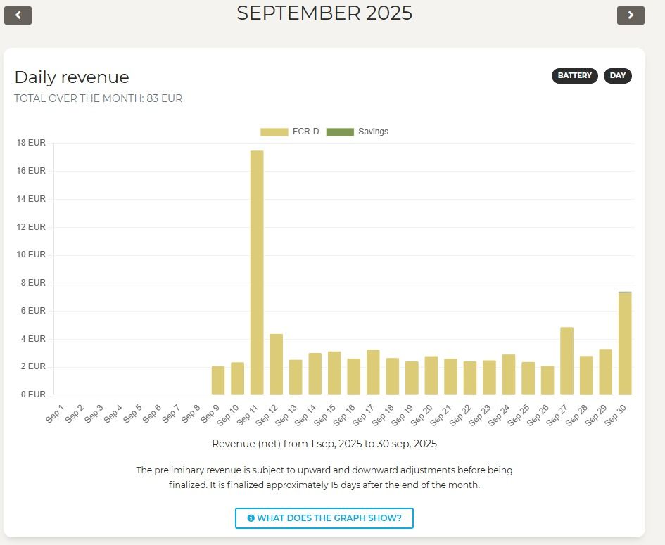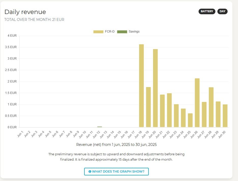 Akku on optimoinut myös pörssisähkön vaihtelua, jota ei näy korvauksissa, vaan se näkyy pienentyneenä sähkölaskuna. Hyödyn määrästä en ole saanut tarkempia tietoja.