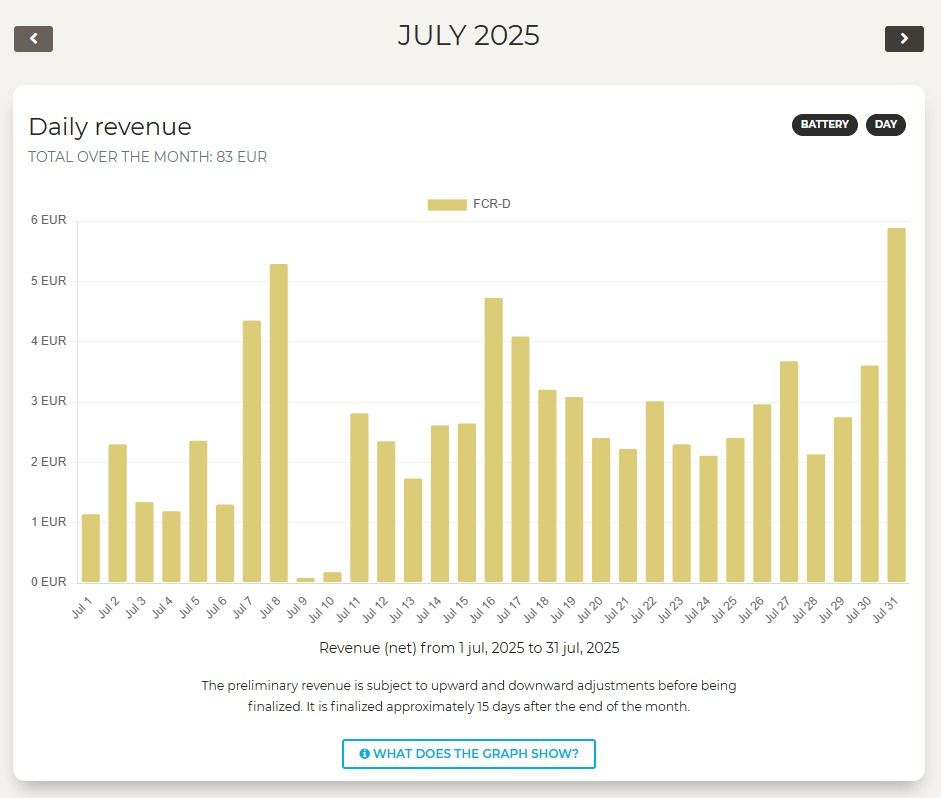 Ensimmäisen kokonaisen kuukauden tuotto heinäkussa 2025 tuotto 83 €. Tästä sekä muistakin summista poistetaan vielä 5 € kiinteä CheckWattin kulu.