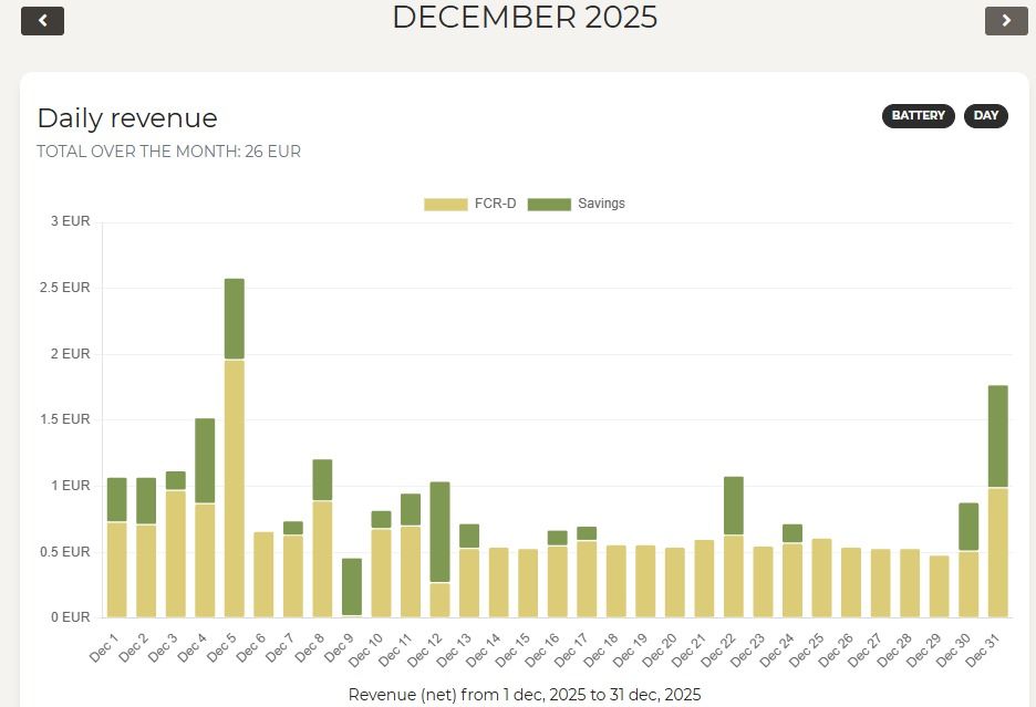 Joulukuun 2025 tuotto näyttää olevan CheckWattin sivustolla yhteensä 26 €, josta pörssisähkön optimoinnista säästö 6 € ja reservimarkkinakorvaus 20 €. 5 € palvelumaksu CheckWattille.
