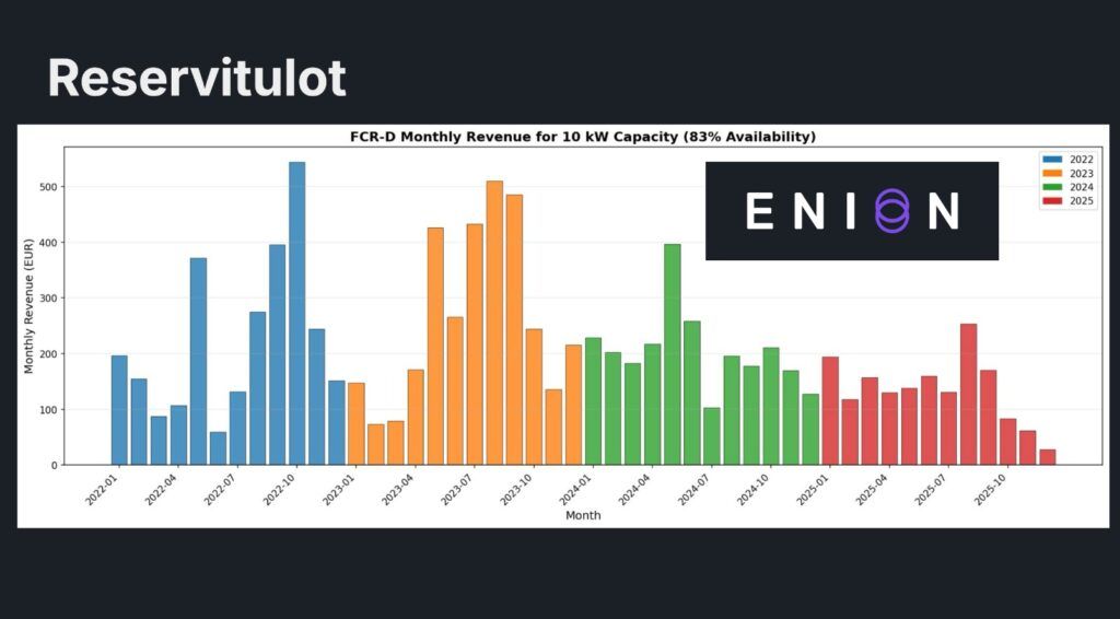 Joulukuussa 2025 Enion tuotti reservimarkkinoilta 26,14 €. Enion vähentää kk-maksun korvauksista. Tässä tapauksessa kk-maksu on ollut enemmän kun korvaus, mutta kuukausimaksu ei voi mennä miinukselle.