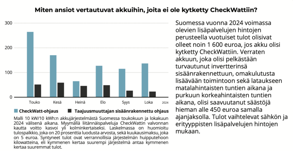 Suomessa vuonna 2024 voimassa olevien reservimarkkinahintojen perusteella 10 kW/10 kWh akkujärjestelmä voi tuottaa noin 1600 euroa vuodessa CheckWatt-ohjauksessa. Vertailun vuoksi, sama akku pelkällä invertterin sisäänrakennetulla ohjauksella tuottaisi noin 450 euroa vuodessa.