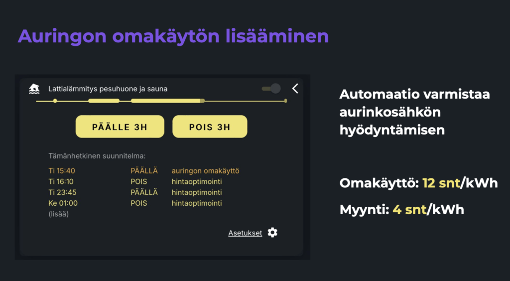 Kun aurinko paistaa, sähkö on edullista. Jos sinulla ei ole älykästä akkujärjestelmää, myyt sen takaisin verkkoon halvalla. Takaisinostaessasi joudut maksamaan siirron, kalliimman sähkön hinnan sekä verot.