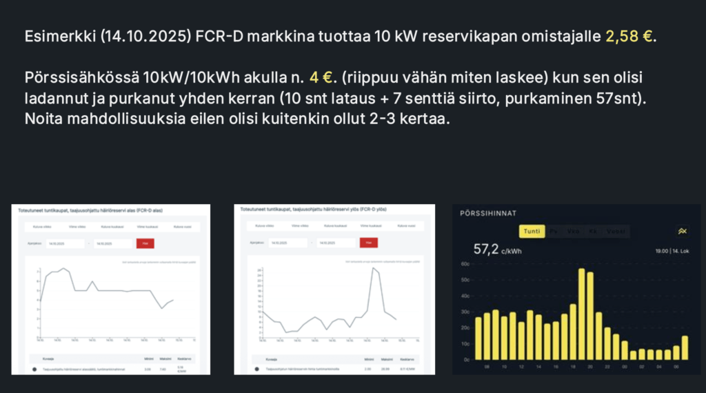 Ohessa esimerkki reserviakun tuotosta. 14.10.2025 reservimarkkina tuotti 10 kW akkujärjestelmän omistajalle 2,58 €.