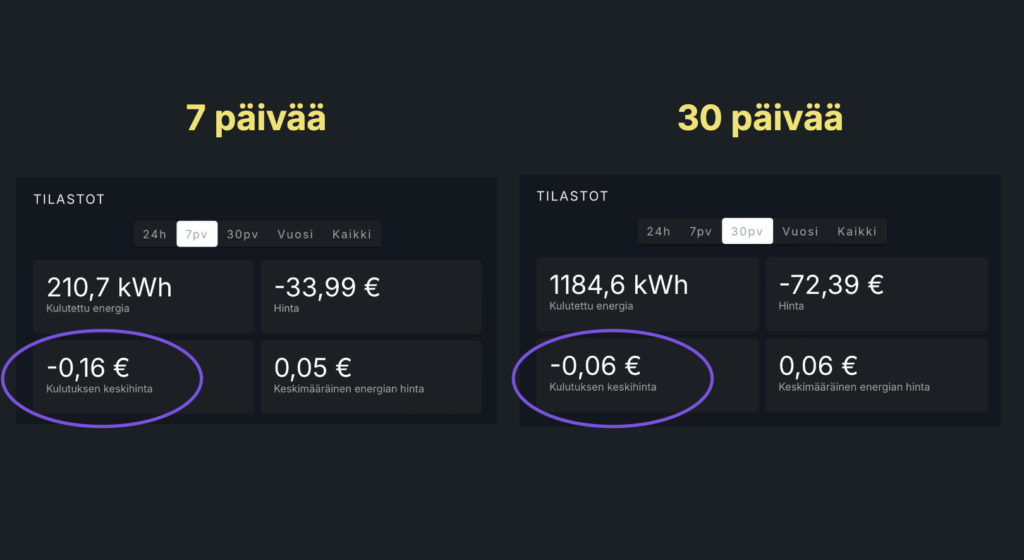 Ilman akkua joudut myymään ylituotannon verkkoon pilkkahintaan (n. 4 snt/kWh) ja ostamaan sähköä illalla kalliilla takaisin. Kun varastoit aurinkopaneelien tuottaaman energian päivällä, voit käyttää sen illalla ja yöllä. Säästät n. 8 snt jokaista itse käytettyä kilowattituntia kohden (säästetty energia + siirto + verot).