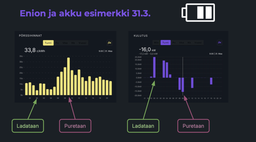 Ajattelee parastasi: Enion laskee joka tunti: ”Tienaako asiakas enemmän säästämällä sähkölaskussa VAI tarjoamalla akkua Fingridin reservimarkkinaan?” Se valitsee aina strategian, jossa sinun rahapussisi voittaa eniten.